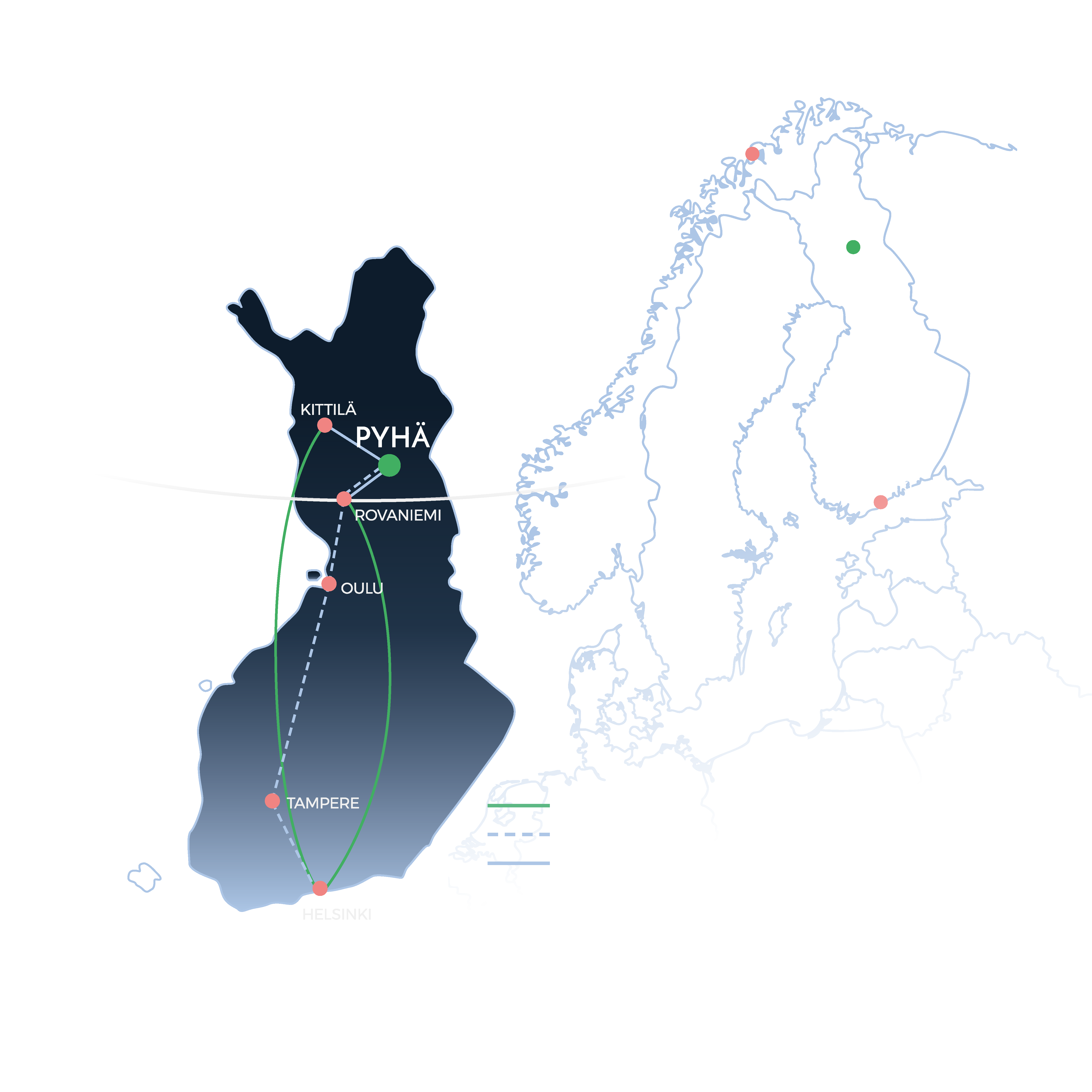Both Rovaniemi and Kittilä have direct flights from over 20 European cities, especially during the winter season.